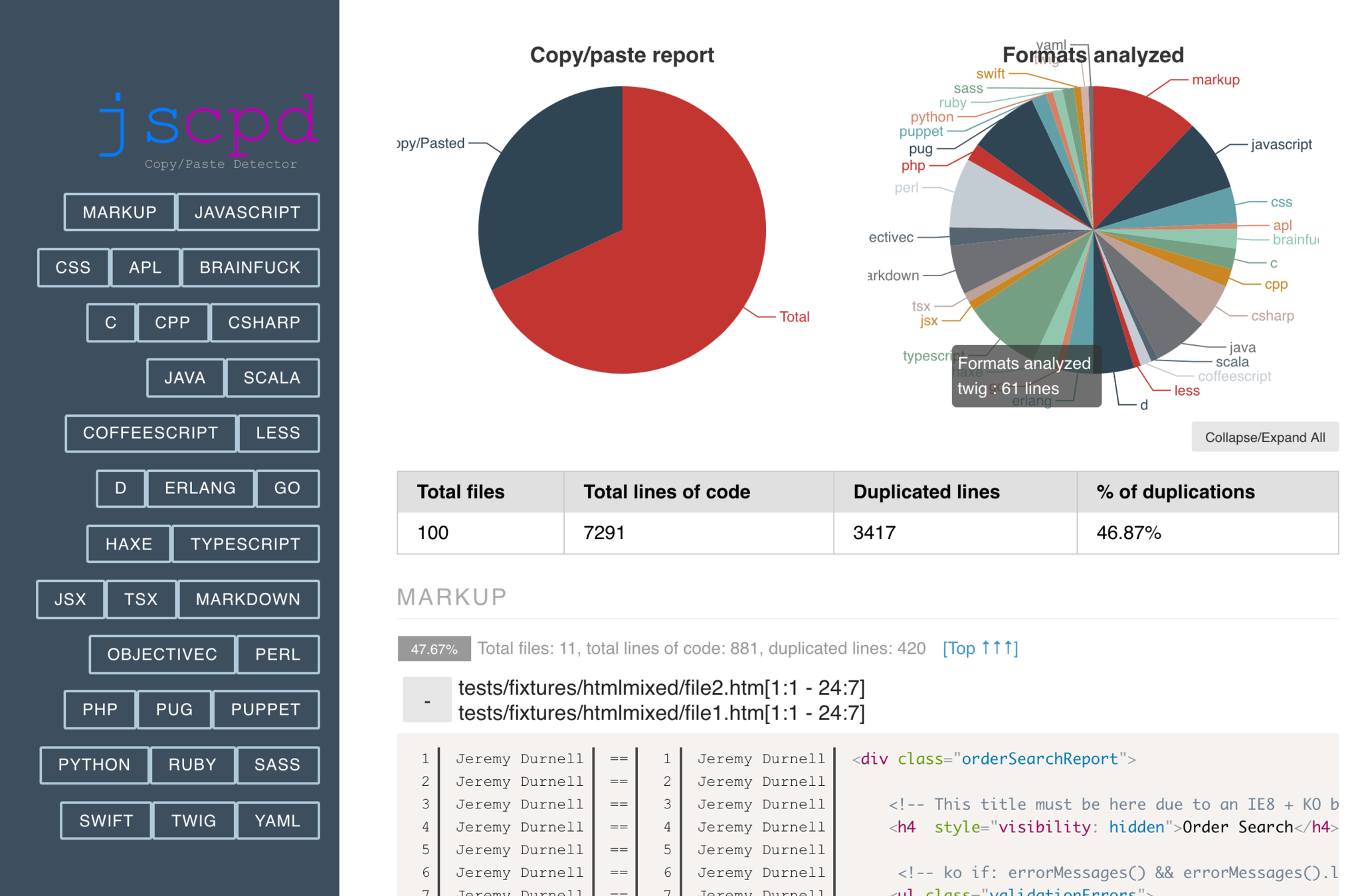 Generate XML report in pmd-cpd format, JSON report, HTML report