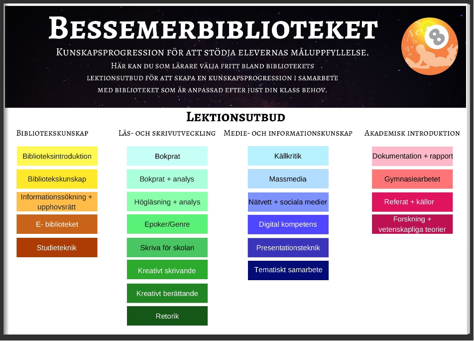 biblioteksplanen, samarbete enligt Bessemermodellen, hur böckerna står uppställda, bibliotekspedagogiskt material, konstvaggan,