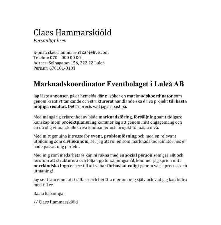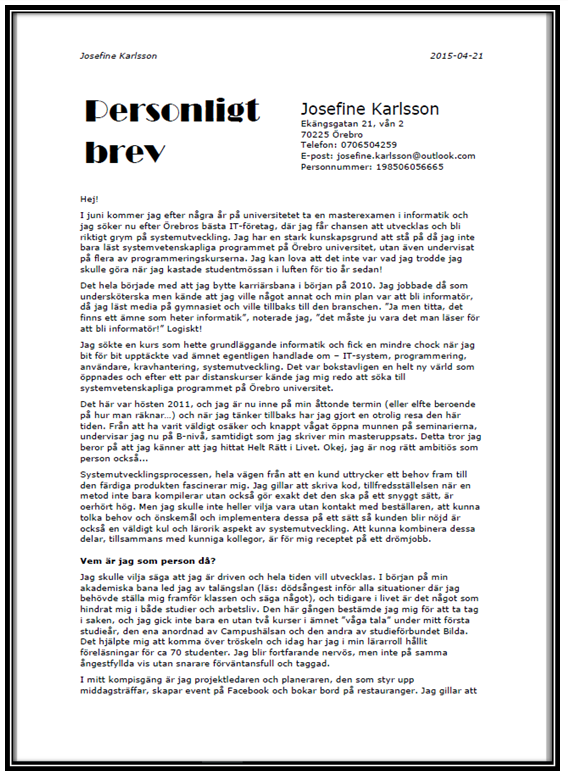Tänk på hur du börjar ditt personliga brev. Arbetsgivaren får antagligen till 90% brev som börjar med "Hej jag heter NN och är siochså gammal." Försök tänka ut något som fångar arbetsgivarens intresse.