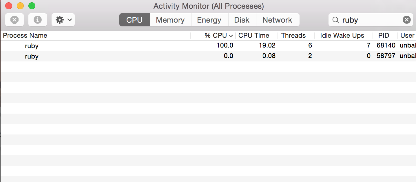 threads.map(&:join)Execution of ruby 1_counter/working_counter.rb with MRI, Rbx and Jruby with Activity Monitor/glances