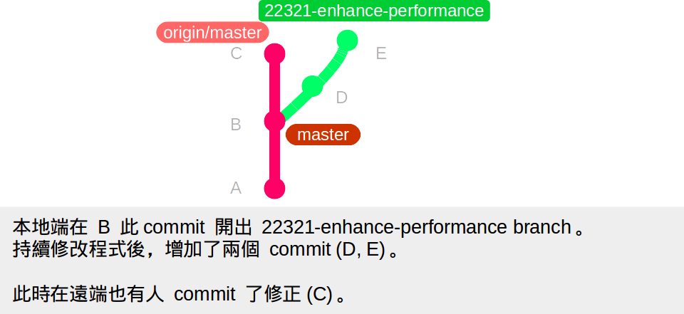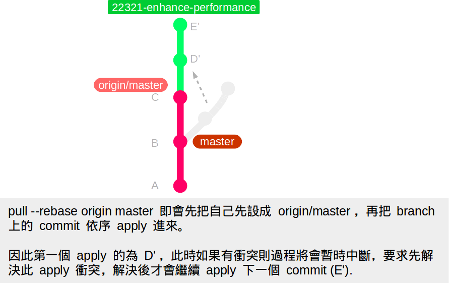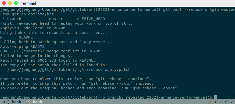 ~/git/brt(22321-enhance-performace)$ git pull --rebase origin master並且修正衝突,再重新 push 至遠端 branch。(請查看修正衝突章節)