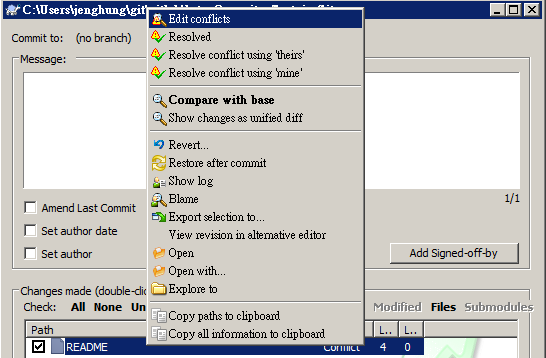 在衝突的檔案上按右鍵,選擇 Edit conflicts,開始要來解決衝突