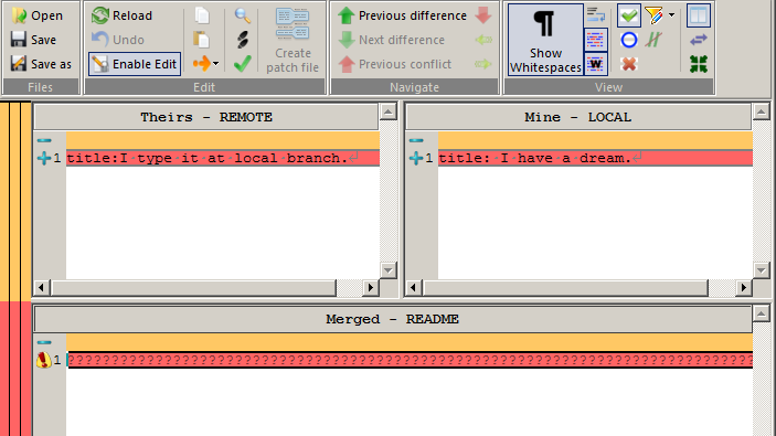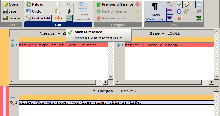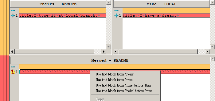 在下面的區塊按右鍵,可用來決定最後解決衝突要使用的版本 (Theirs or Mine),當然也可兩個都不選直接編輯。