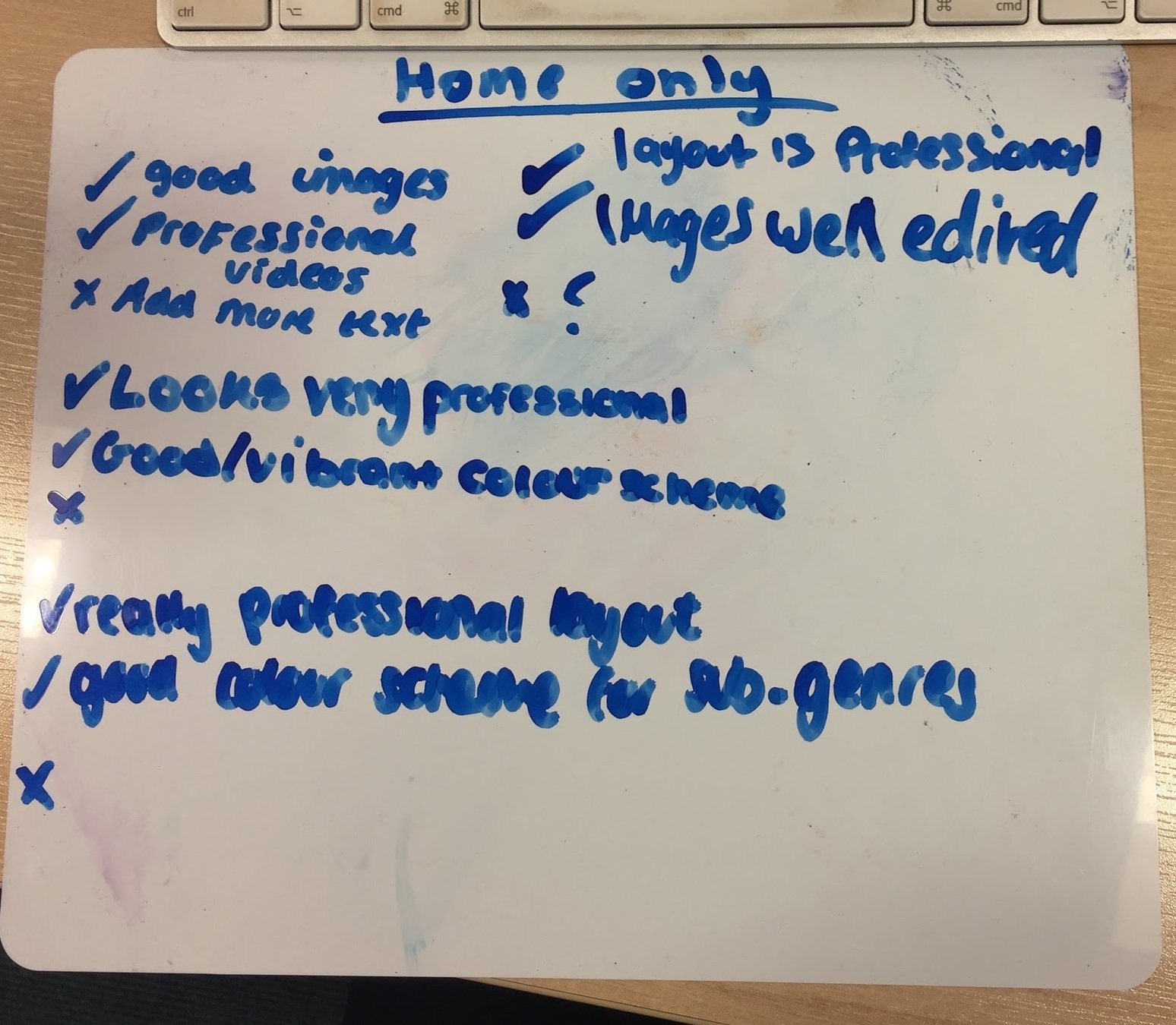 By this point I felt I had received a considerable amount of feedback and had began to construct my products. When creating them I regularly received feedback from my piers, friends and college lecturer to ensure I was creating a professional product but also one that my target audience wanted to read. I received the feedback in a variety of ways, from audio to post-it notes, white boards to printouts and assessment papers. Throughout my drafts I felt it made more sense to put the feedback in there so that a more gradual progression could be seen and the way I was influenced by the feedback. Compiling all of my draft and feedback into a single powerpoint resulted in an overall more organised and chronological order of events and changes, making the changes easier to see.
