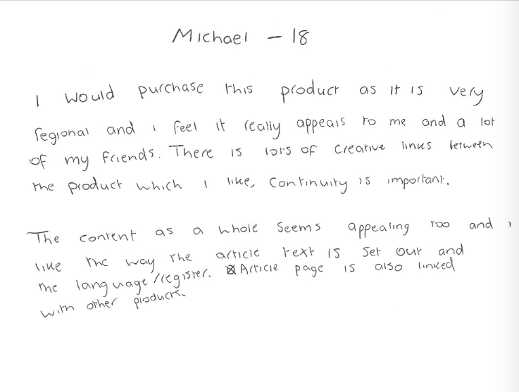 My Final Feedback was complete as a means to confirm my products ability to compete in the industry. From he feedback m target audience told me mainly that they liked the product and that they felt it was "appealing" and that there was "lots of creative links" within my products, linking ancillary and main products. One of the audiences even went as far as to say they "would purchase this product" despite it being free. I feel this is very indicative of the standard my work is at but also shows the amount of work I have put into this process.