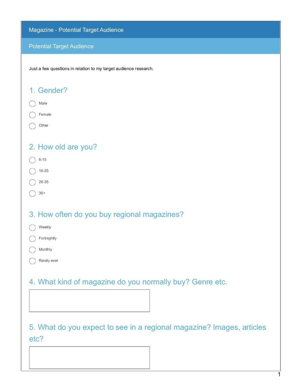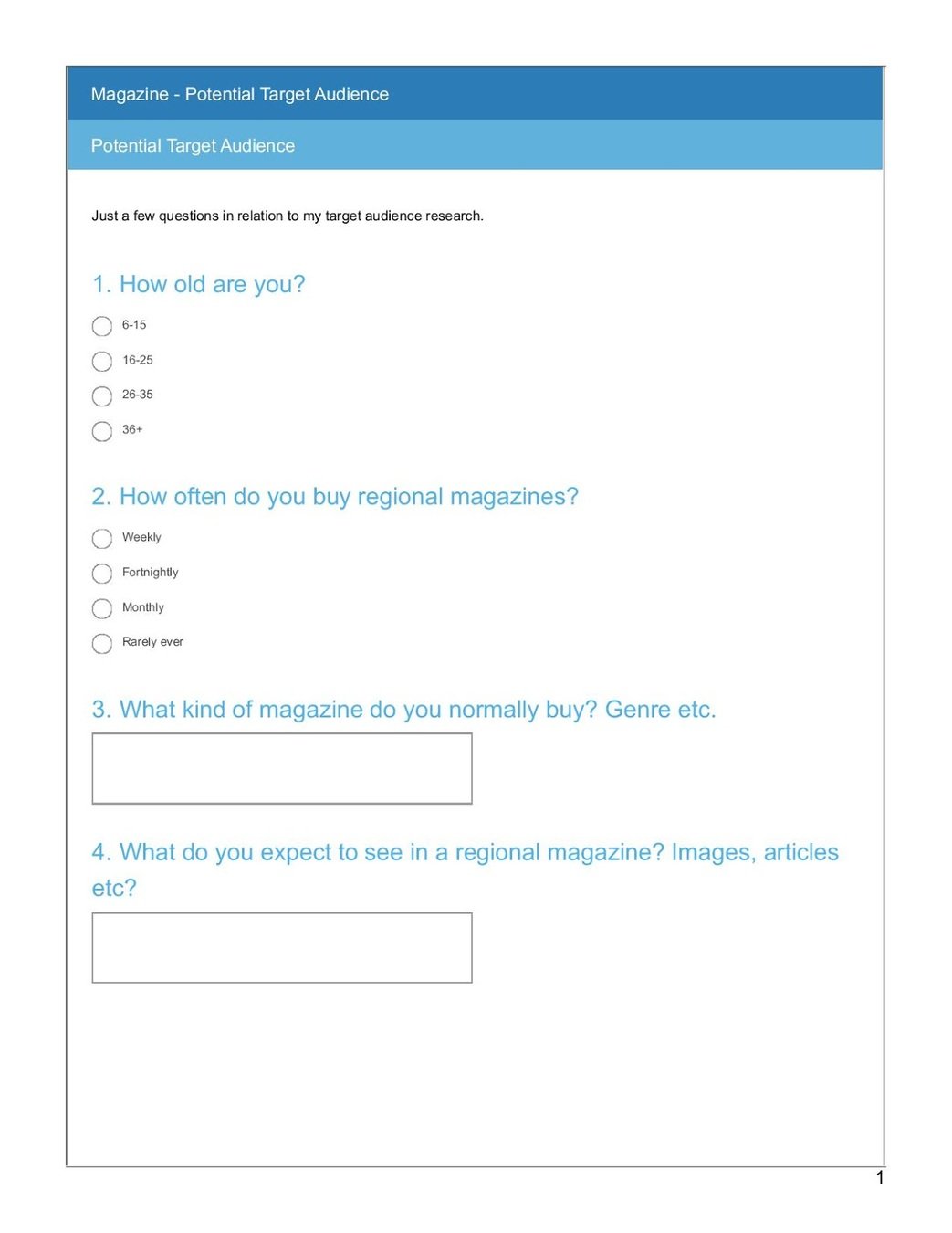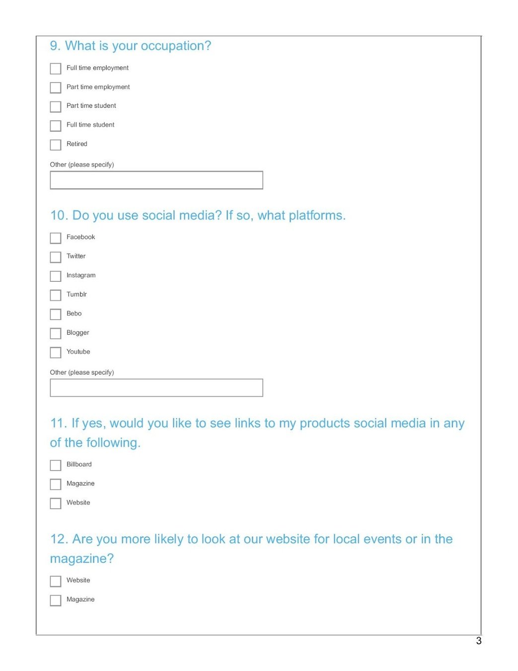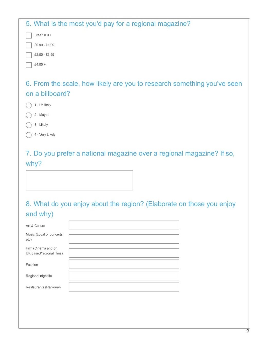After discovering how much of my audience used social media through the surveys, I decided to take advantage of this through Facebook Survey and asked my friend some questions about what would interest her. Doing this only confirmed a number of the things which I had previously discovered about my target audience, such as the genres which the age group was interested in and their want for regional events and information. My friend also made it clear through the interview that having regional locations shown through images would be an important feature to her if she was to buy the product or she would find it difficult to tell it was in fact a regional product.