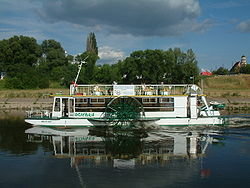 Współczesny polski bocznokołowy statek wycieczkowy – " Jagienka " podczas rejsu wycieczkowego po Warcie w Poznaniu w okolicy mostu św. Rocha.