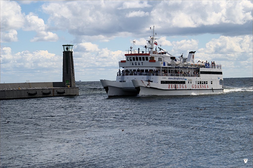 Polski katamaran żeglugi przybrzeżnej Agat w główkach portu Gdyńskiego