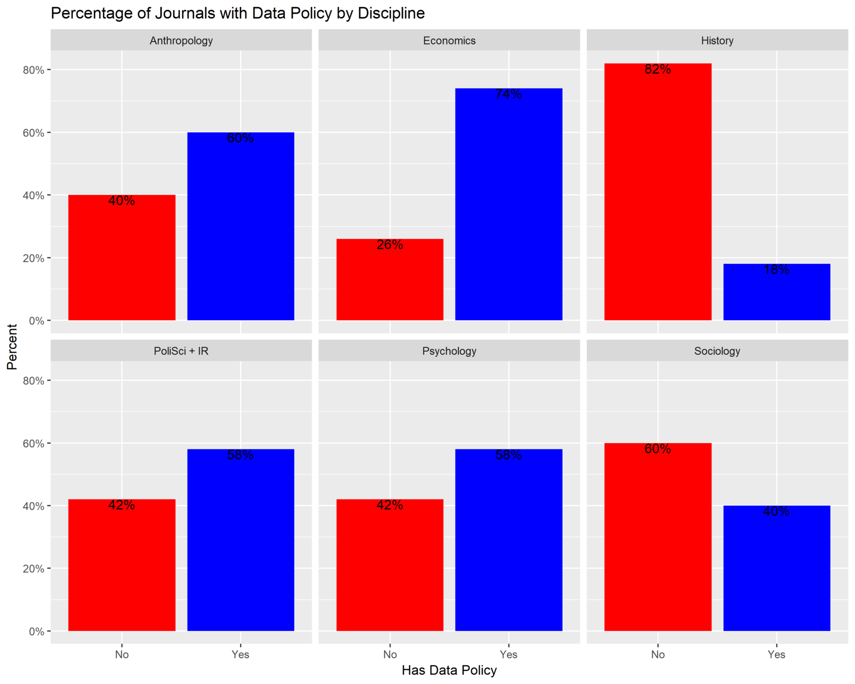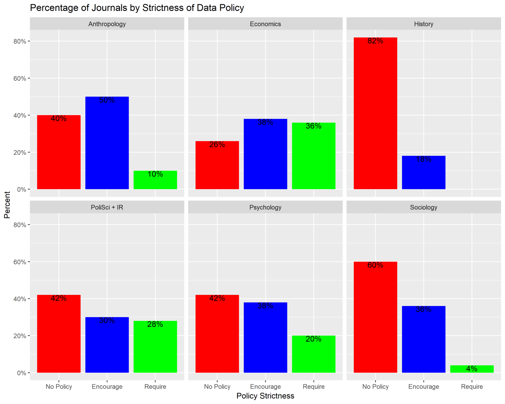 Economics, Political Science, and Psychology have higher # of journals requiring data sharing