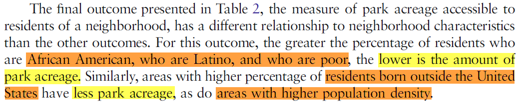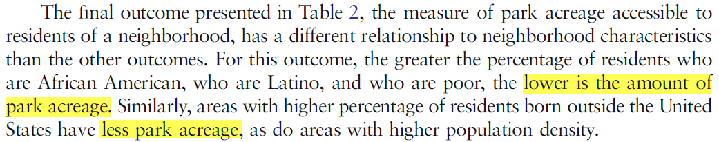 Weiss et al. (2011) reported that, "the greater the percentage of residents who are African American, or who are Latino, and who are poor, the lower is the amount of park acreage."