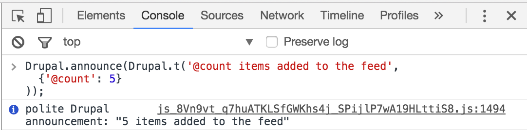 Drupal.announce(Drupal.t('@count items added to the feed',