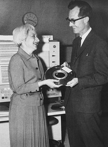 Henriette Avram remet une bande magnétique contenant 9,300 enregistrements à Richard Coward de la British National Bibliography, en 1967.