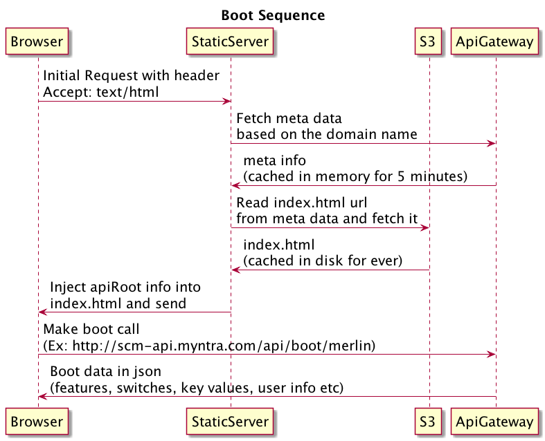 Spectrum as a framework contains a command-line tool (spectrum-cli) to generate the react/redux template code and build the js/css bundles using webpack. It generates shell scripts to push those bundles into CDN. It has a hosted static server (spectrum-static) to serve the index.html and other static contents like fonts, icons and images. The below diagram shows the boot sequence.