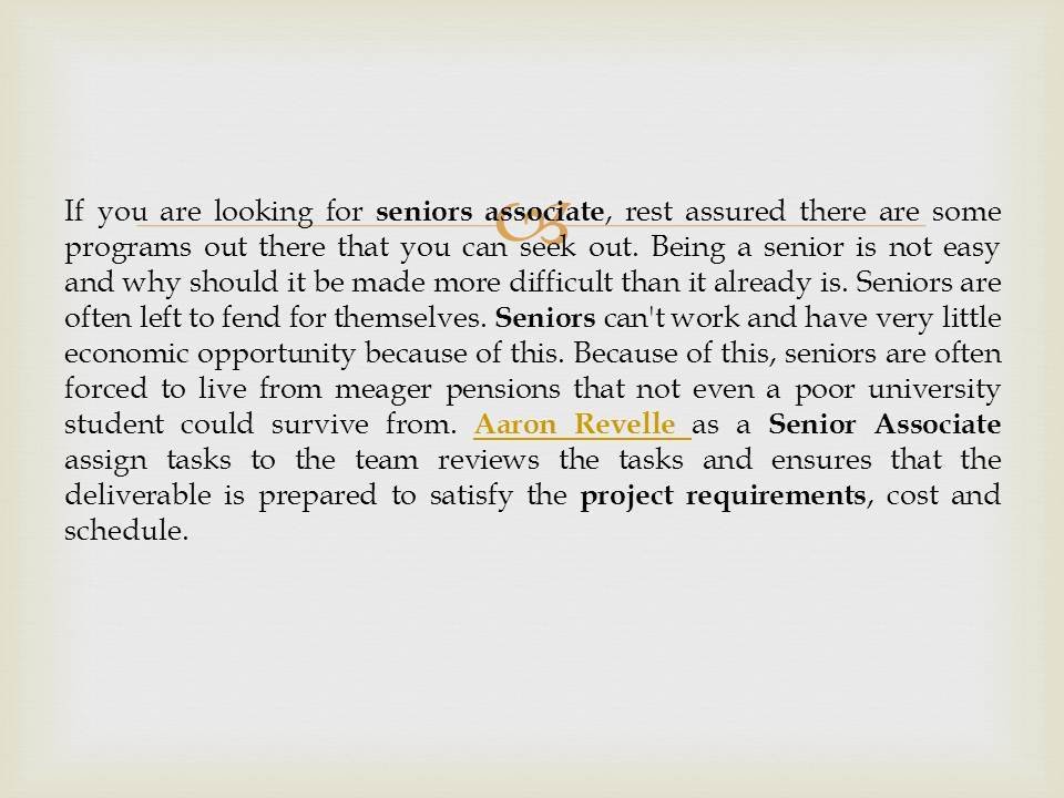Aaron Revelle Build positive working relationship with clients and ensure client satisfaction. In this presentationb, You will get to know about Senior Associate. http://www.authorstream.com/Presentation/aaronrevelle-4167647-aaron-revelle-role-skills-senior-associate/