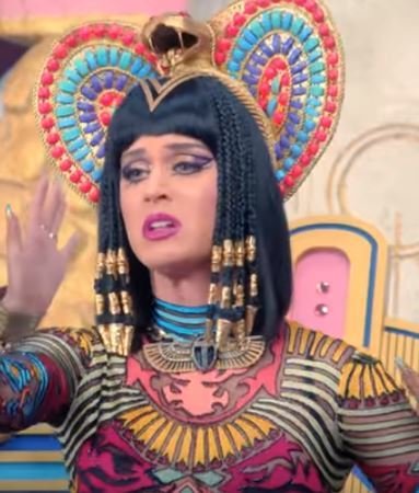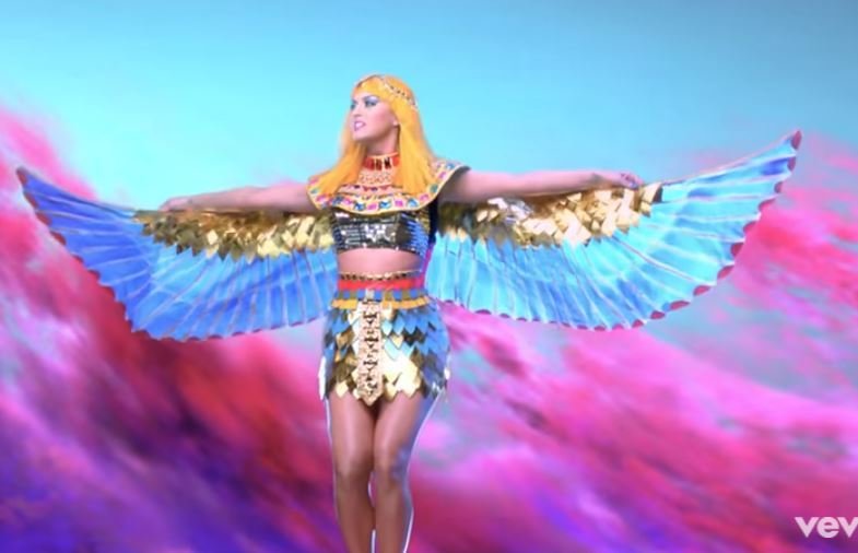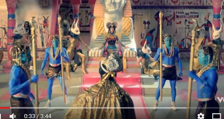 - "Dark Horse" by Katy Perry,in which she portrays to be Cleopatra the egyptian queen, she is shown wearing a colorful dress and a wig sitting on her throne. And is also shown at the top of the pyramid in a scene, dressed as Isis ( the egyptian goddess).