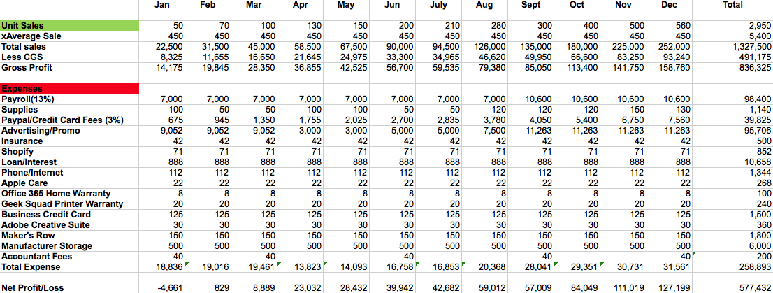 - Average sale price is $450; Cost of Good Sold is $167