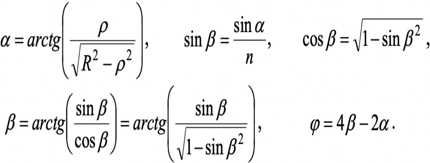 На шарообразную каплю воды (n = 1) радиусом Rem> падает параллельный световой пучок. Необходимо определить зависимость угла отклонения α световых лучей от прицельного параметра ρ и угла преломления β.