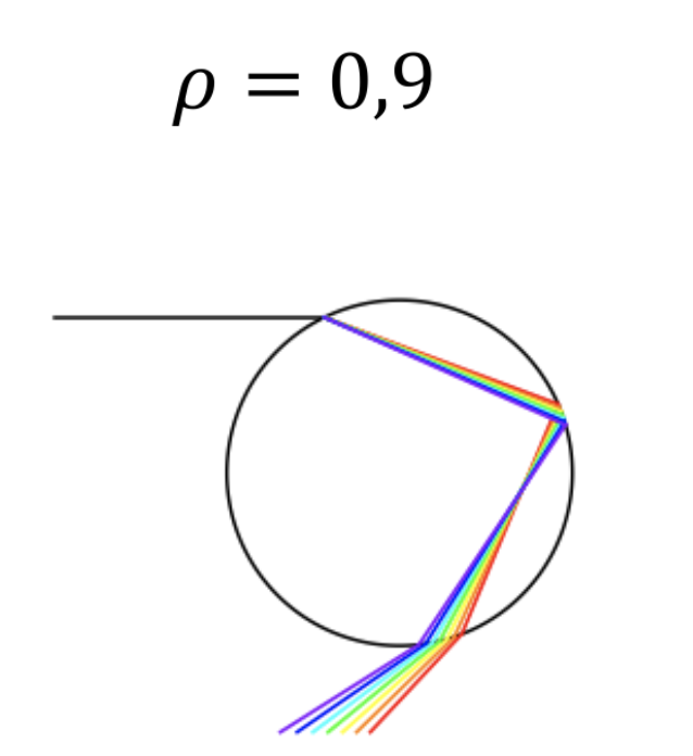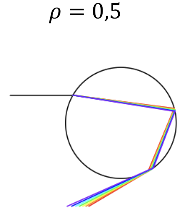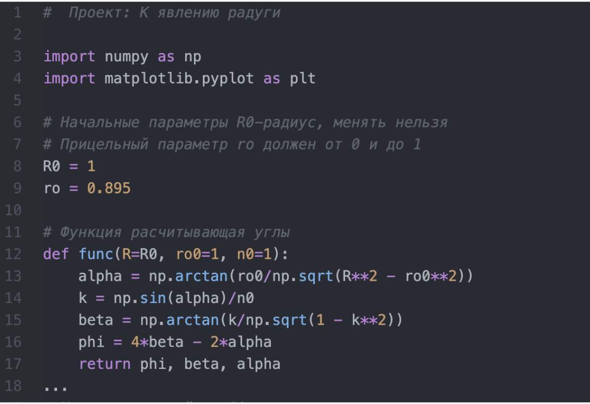 Проведённое исследование наглядно продемонстрировало возможности языка Python и его библиотек по численному моделированию движения светового потока в преломляющем его теле. Было показано, что изменение прицельного параметра меняет картину отражения и преломления. Так, при его нулевом значении процесса преломления не происходит вовсе, а с его ростом двойное отражение и преломление луча света в капле воды обеспечивает всё более и более заметное разложение светового пучка на спектральные компоненты