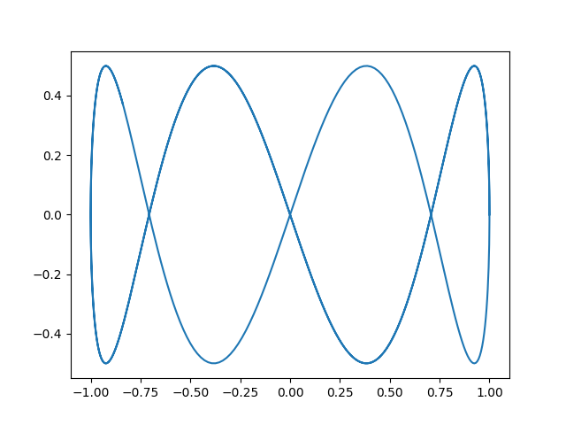 import numpy as np import matplotlib.pyplot as plt a = 1 b = 4 A = 1 B = 0.5 delta = np.pi / 2 N = 500 t = np.linspace(0, 10, N) x = A * np.sin(a * t + delta) y = B * np.sin(b * t) plt.plot(x, y) plt.show()
