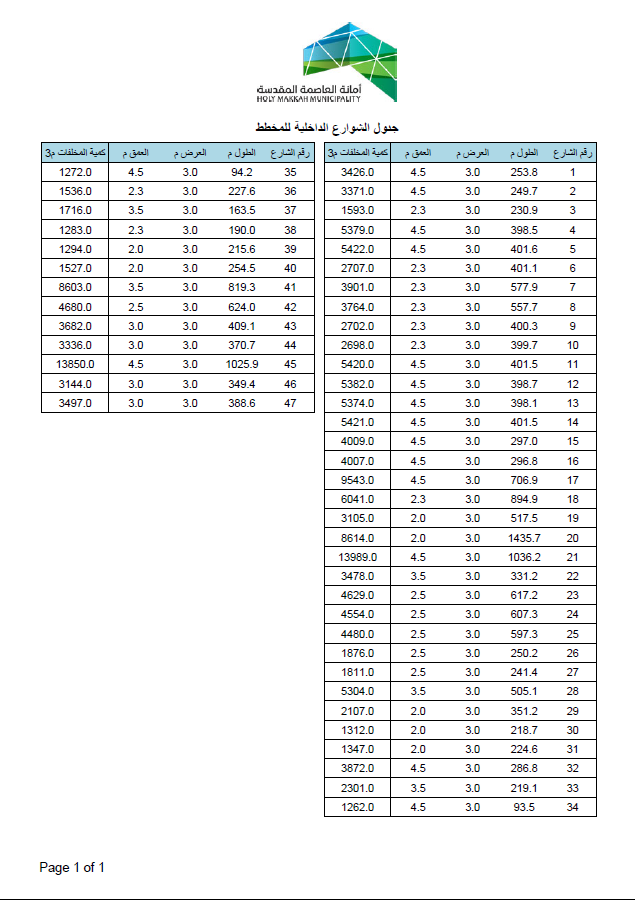 الطرق الداخلية بالمخطط تشمل أطوال وعروض وأعماق أعمال الحفر.