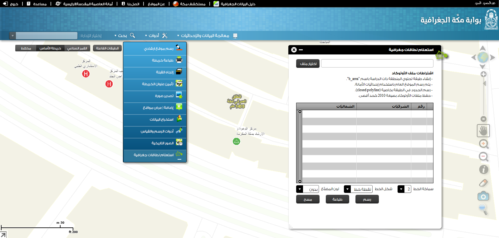 3- بعد تحديد الاحداثيات الخاصة بالموقع - يتم الضغط على زر "رسم" وذلك لرسم الموقع الجغرافي على الخريطة والبدء في عملية الاستعلام عن النطاقات الجغرافية