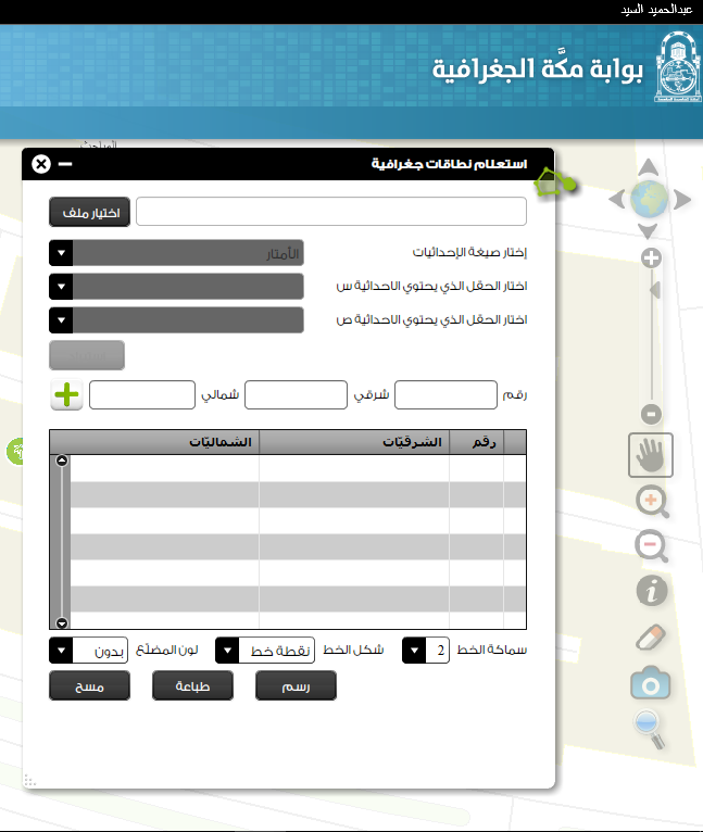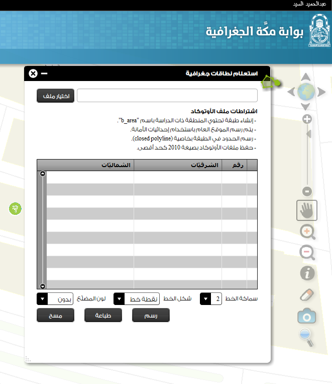 - رفع ملفات الأوتوكاد والاكسل التي تحتوي حدود الموقع العام المطلوب الاستعلام عن النطاقات الواقعة فيه.