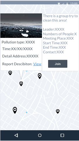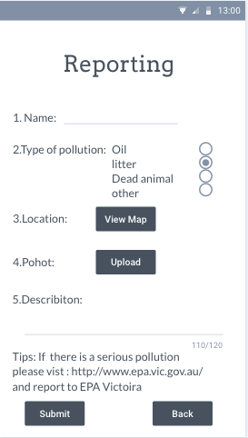 Mobile application for reporting pollution incidents and enables volunteers to provide aid.