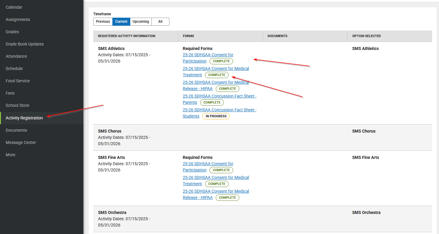 You know you are done when you open activity registration and you see the completed forms. The concussion fact sheet needs to be filled out by your student from their student portal account.
