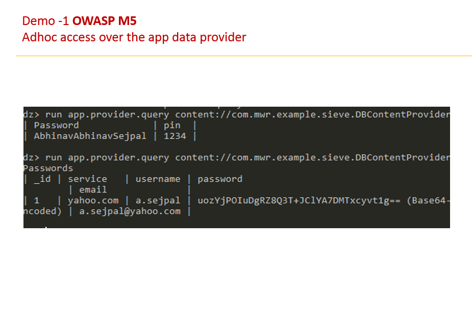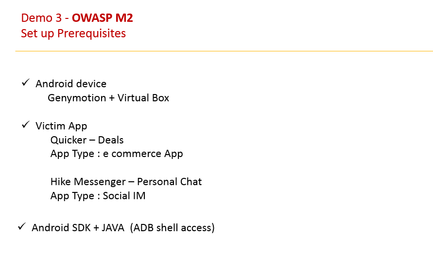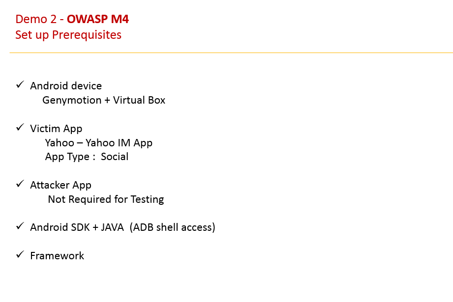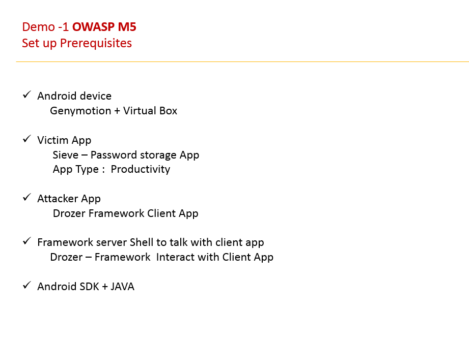 Introduction to Android • Android Architecture • Android Security Architecture • Android Permission model • Application Sandboxing • Setting up Android Emulator • Setting up a Mobile Pentest Environment • Bypassing Android Permissions · Application Analysis · Reverse Engineering · Introduction to Drozer · Using Drozer to find and exploit vulnerabilities · Traffic Interception (Active and Passive) of Android Applications · OWASP Top 10 for Android