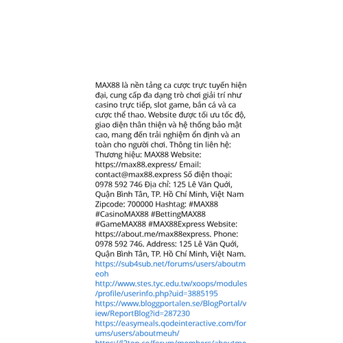 Website: https://about.me/max88expresshttps://about.me/max88express MAX88 là nền tảng ca cược trực tuyến hiện đại, cung cấp đa dạng trò chơi giải trí như casino trực tiếp, slot game, bắn cá và ca cược thể thao. Website được tối ưu tốc độ, giao diện thân thiện và hệ thống bảo mậ