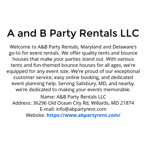 https://www.abpartyrent.com/ Welcome to A&B Party Rentals, Maryland and Delaware's go-to for event rentals. We offer quality tents and bounce houses that make your parties stand out.