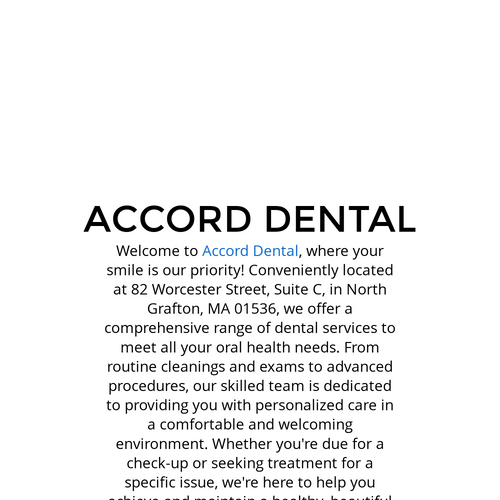 Welcome to Accord Dental, where your smile is our priority! Conveniently located at 82 Worcester Street, Suite C, in North Grafton, MA 01536, we offer a comprehensive range of dental services to meet all your oral health needs. From routine cleanings