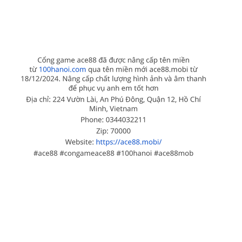 Cổng game ace88 đã được nâng cấp tên miền từ 100hanoi.com qua tên miền mới ace88.mobi từ 18/12/2024. Nâng cấp chất lượng hình ảnh và âm thanh để phục vụ anh em tốt hơn Địa chỉ: 224 Vườn Lài, An Phú Đông, Quận 12, Hồ Chí Minh, Vietnam Phone: 0344032211 Zip: 70000 Website: https://ace88.mobi/ #ace88 #congameace88 #100hanoi #ace88mob