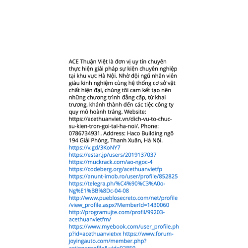 Website: https://acethuanviet.vn/dich-vu-to-chuc-su-kien-tron-goi-tai-ha-noi/https://acethuanviet.vn/dich-vu-to-chuc-su-kien-tron-goi-tai-ha-noi/ ACE Thuận Việt là đơn vị uy tín chuyên thực hiện giải pháp sự kiện chuyên nghiệp tại khu vực Hà Nội. Nhờ đội ngũ nhân viên giàu kinh nghiệm cùng hệ thống cơ sở vật chất hi