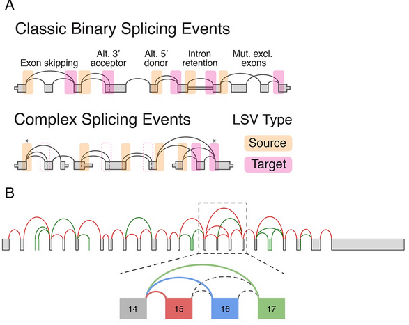 (a) LeafCutter uses split reads to uncover alternative choices of intron excision by finding introns that share splice sites. In this example, LeafCutter identifies two clusters of variably excised introns.