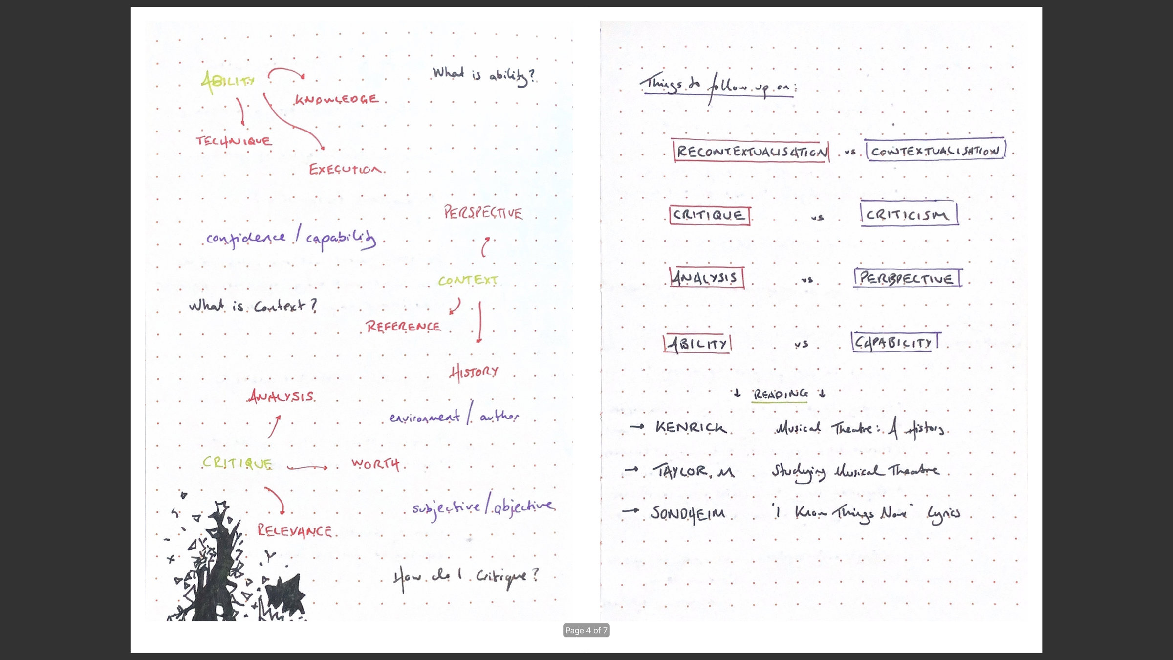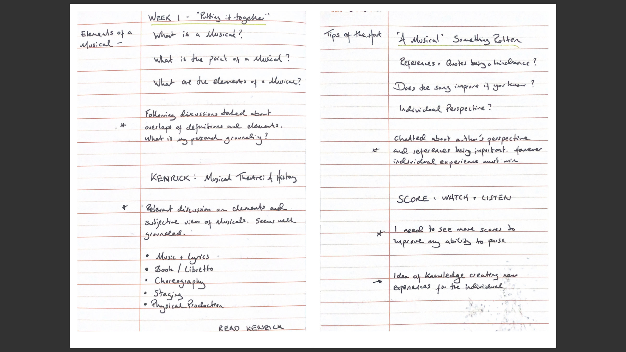 Note taking can exist in many forms. In writing, in audio recordings, in mind maps & graphs, in doodles, in frequent discussion, in questions that you ask your peers and lecturers. Think curiosity breeding.