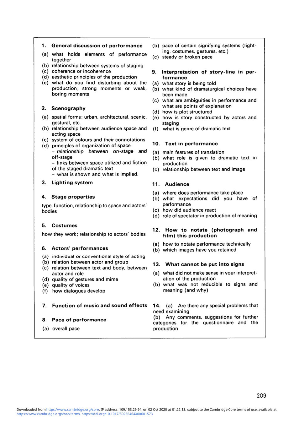 One of the problems of applying semiotic techniques to theatre work has been a vocabulary which too often mystifies rather than clarifies the theatre experience for the non-specialist student. Patrice Pavis, in his work with students at the University of Paris III. has evolved a questionnaire about theatre performance which, while not in itself utilizing semiotic terminology, attempts to direct the respondents' attention to all the aspects of theatrical signification upon which it touches. In the following article, Patrice Pavis, whose major study of theatrical terminology, entitled Dictionnaire du Theatre, was published by Editions Sociales in 1980, outlines the purpose of the questionnaire, and provides explanatory notes to the individual questions, outlining an approach on which many involved in theatre teaching may wish to comment and build.