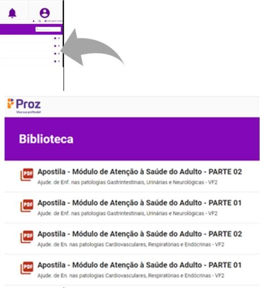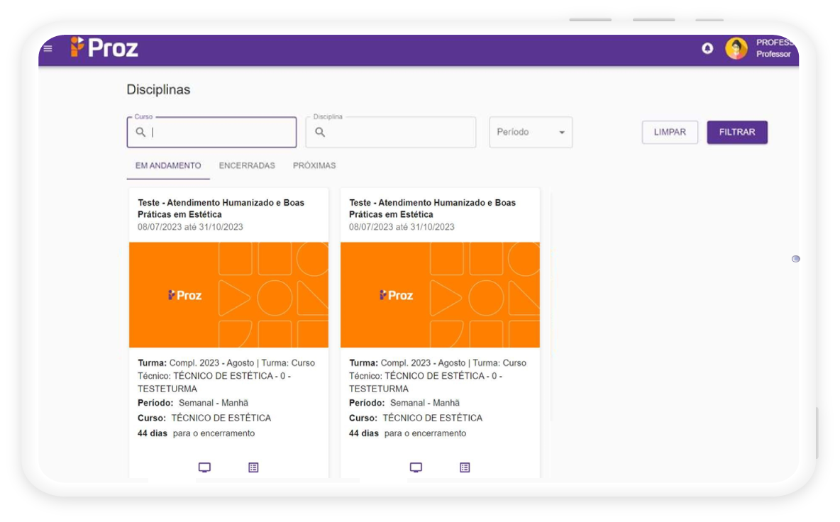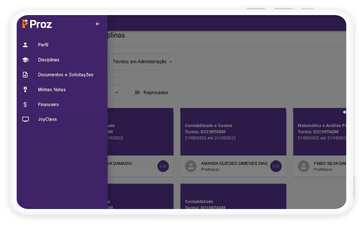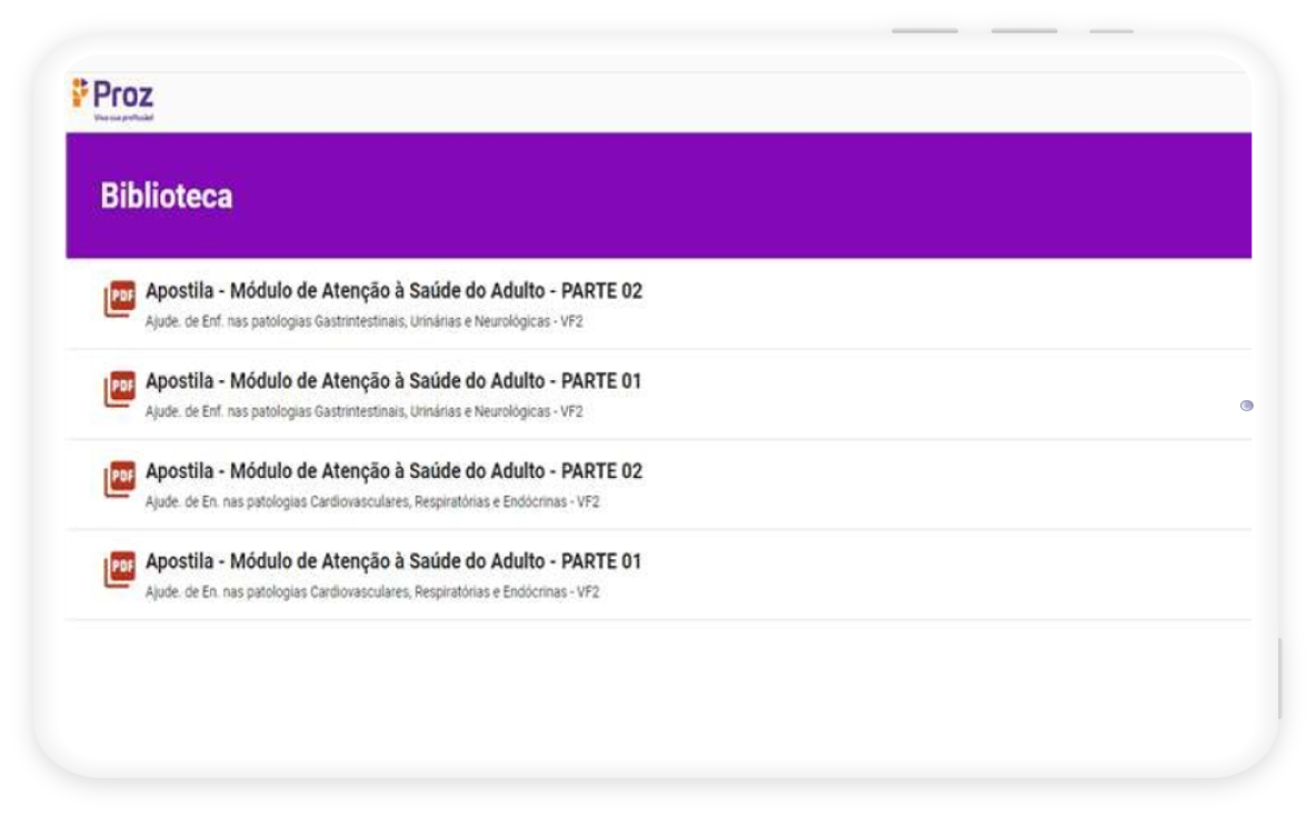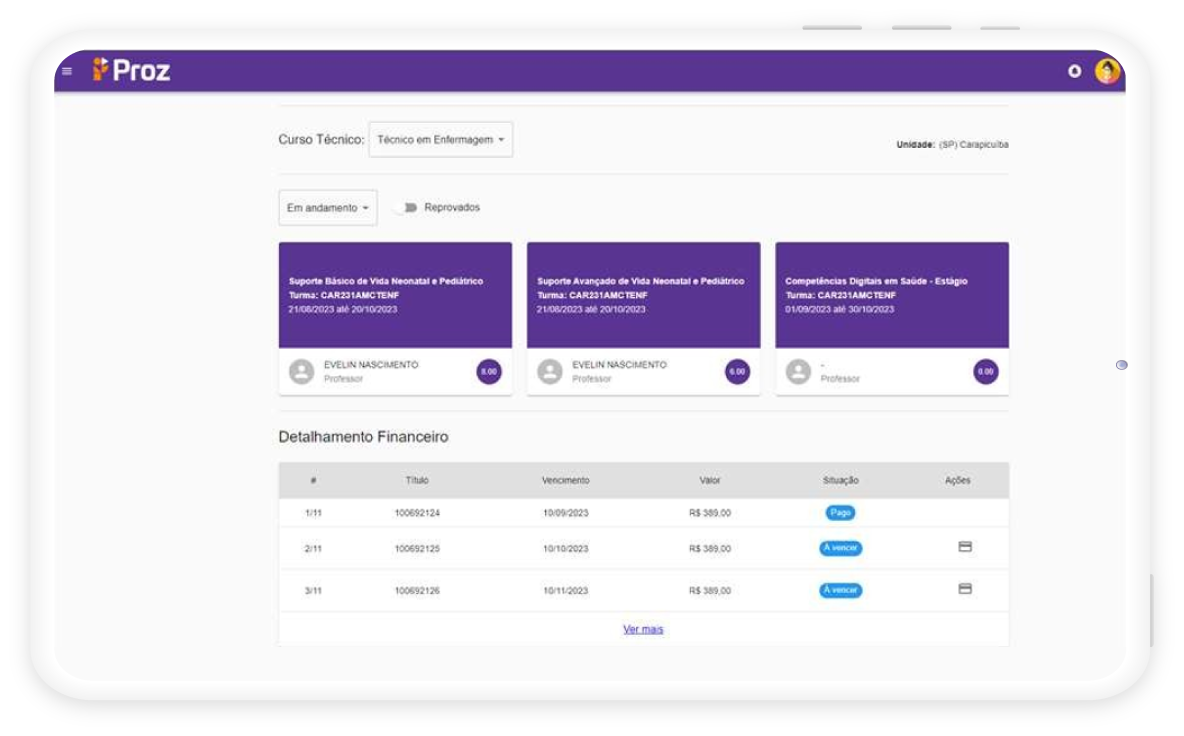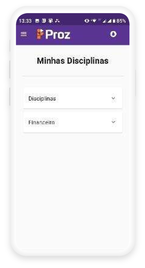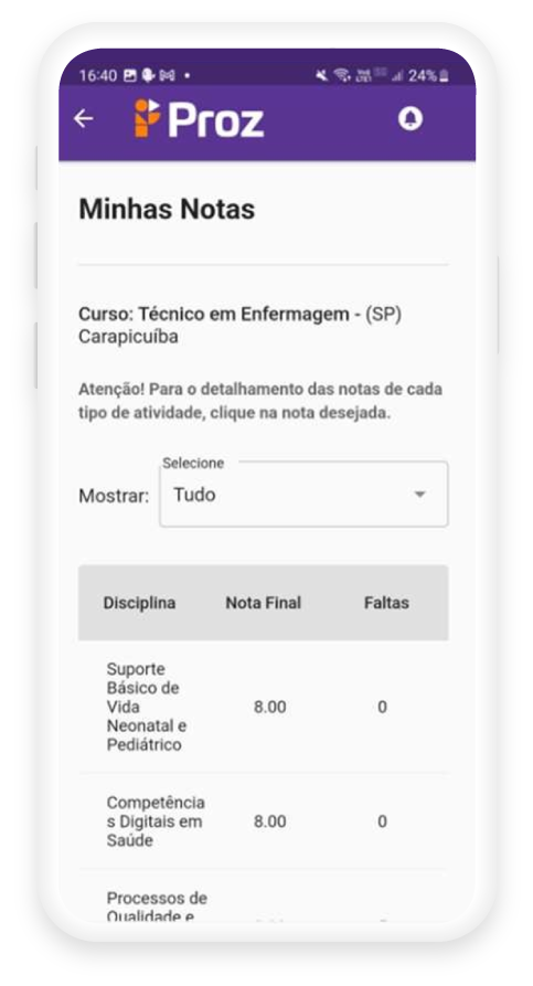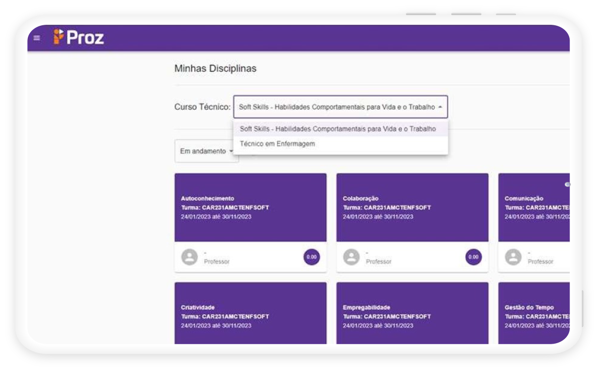 Clique no cartão roxo da disciplina no APP do aluno ou na plataforma Website da Proz Educação.