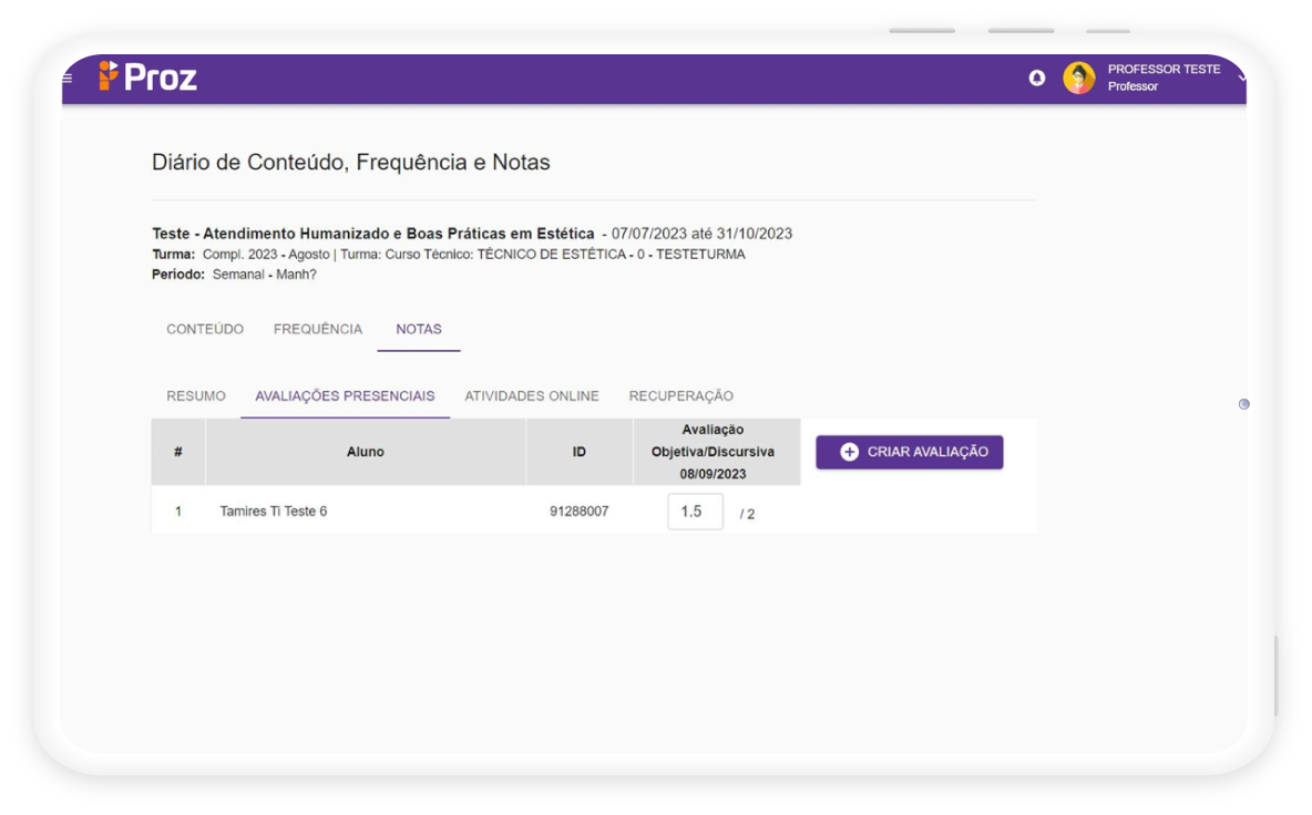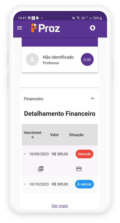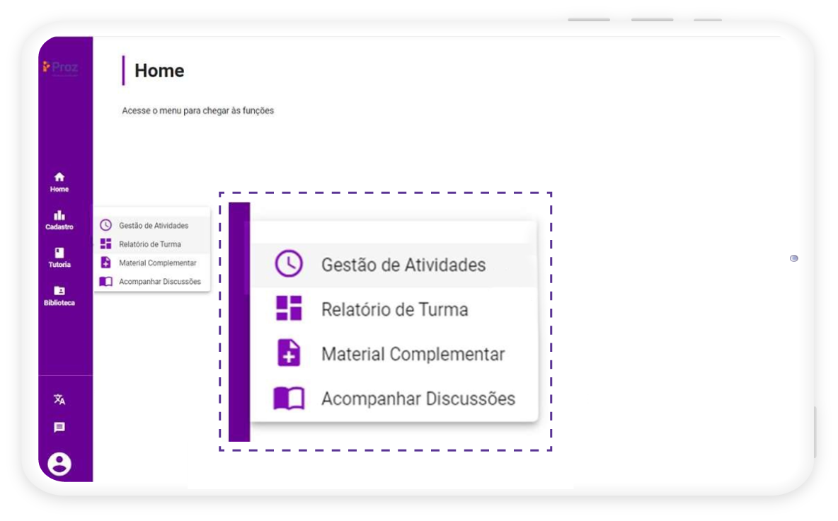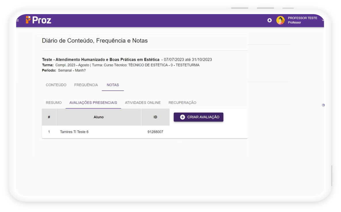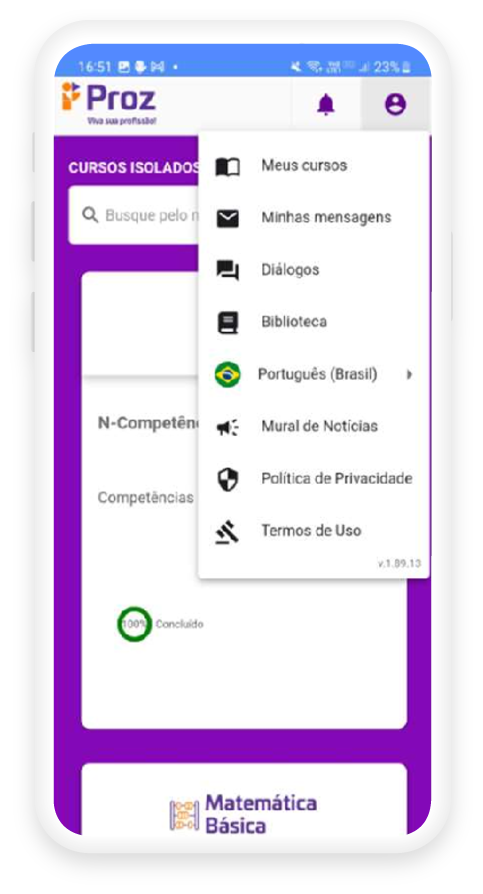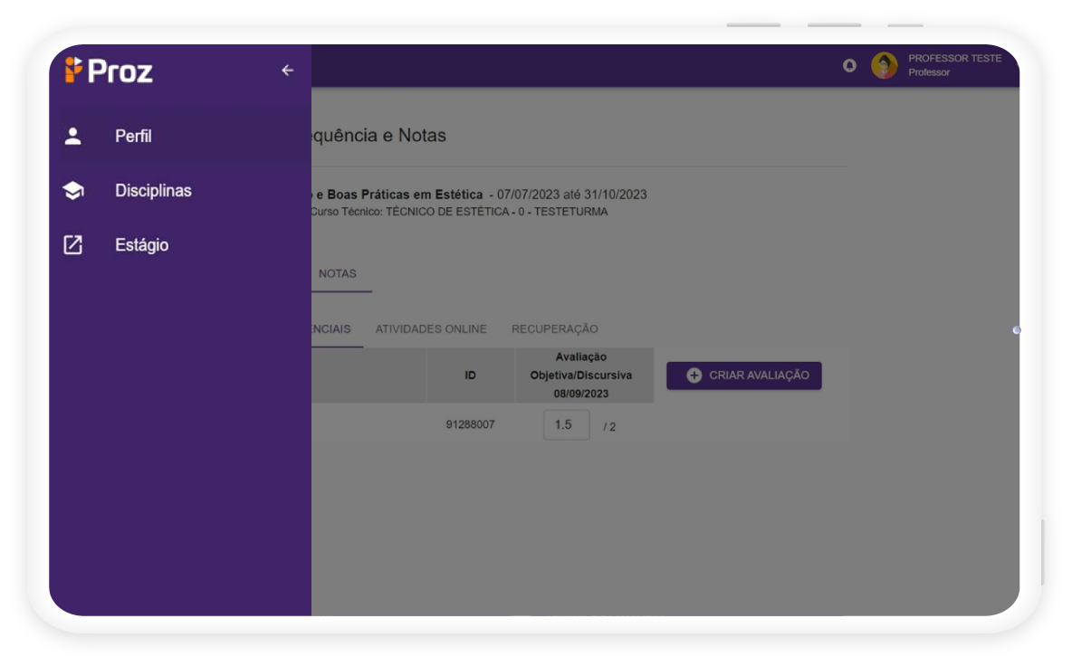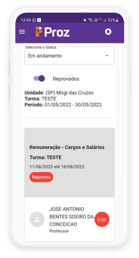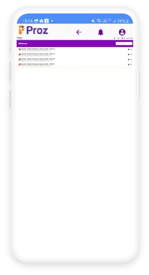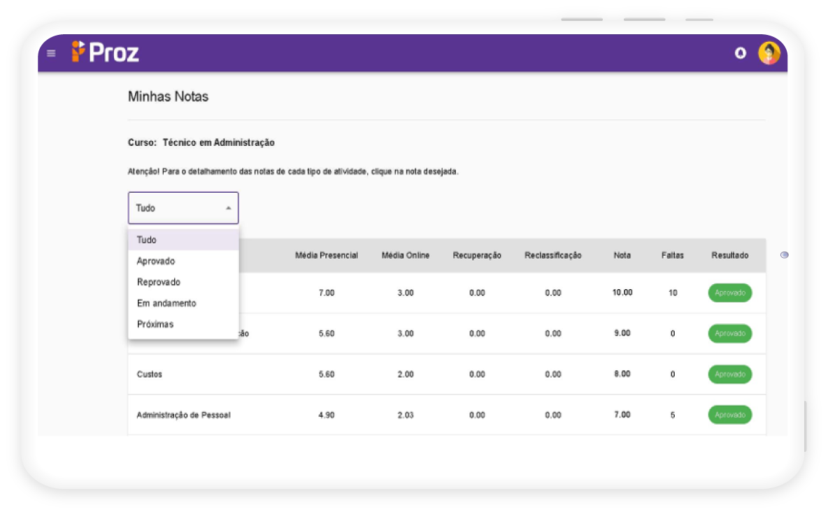 Clique no cartão roxo da disciplina no APP do aluno ou na plataforma Website da Proz Educação.