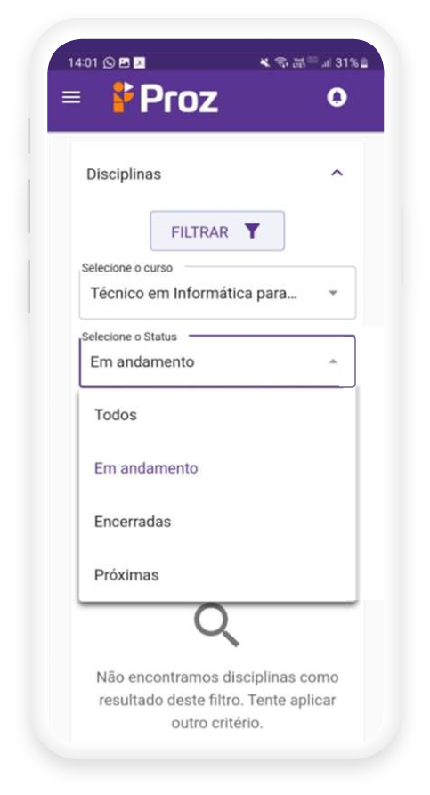 Selecione o status da disciplina que deseja consultar e o aplicativo apresentará as disciplinas de acordo com sua seleção.