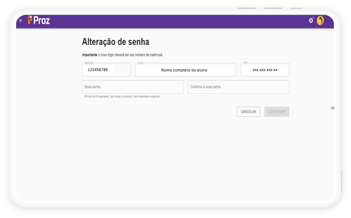 Logo após o acesso, o sistema apresentará a tela ao lado e o sistema solicitará a criação de uma nova senha de escolha pessoal do aluno.