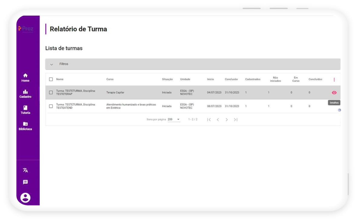 08. Ao clicar em Tutoria e depois em relatório da turma você pode acompanhar o desempenho dos alunos na disciplina selecionada.