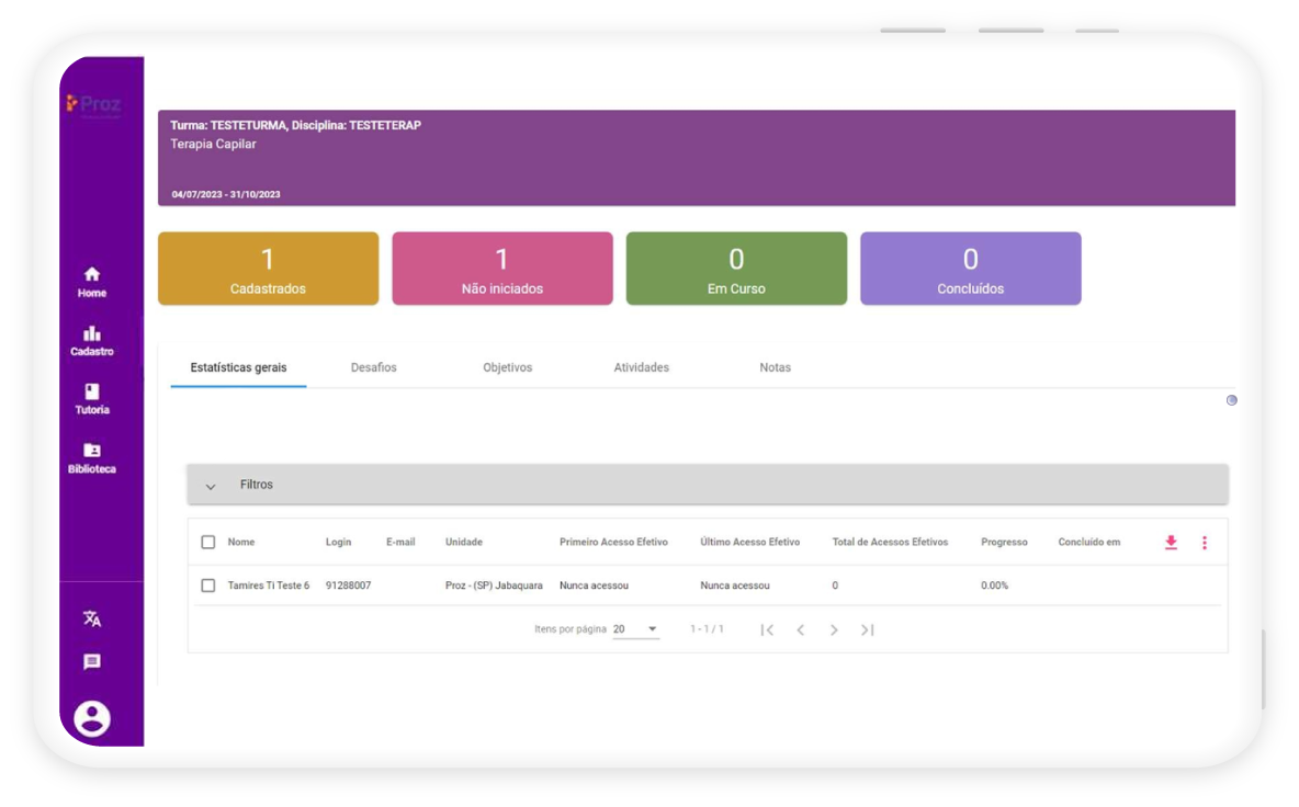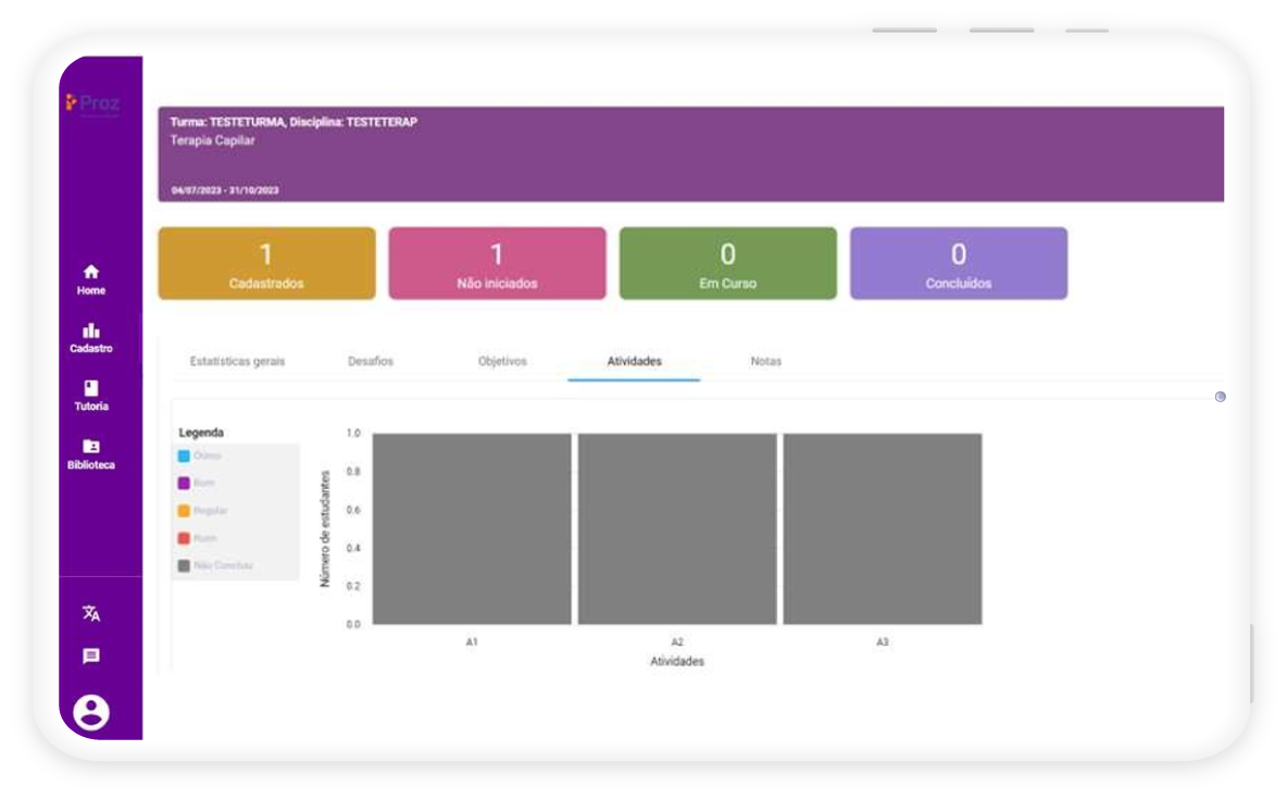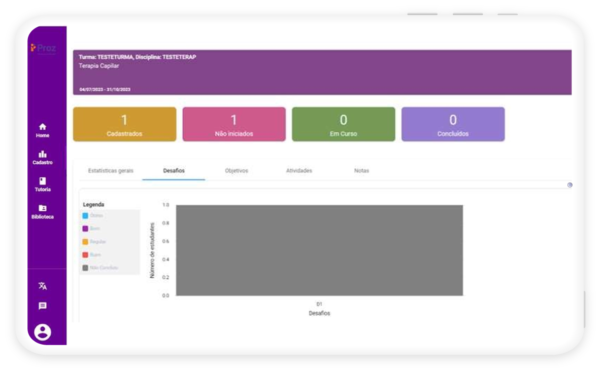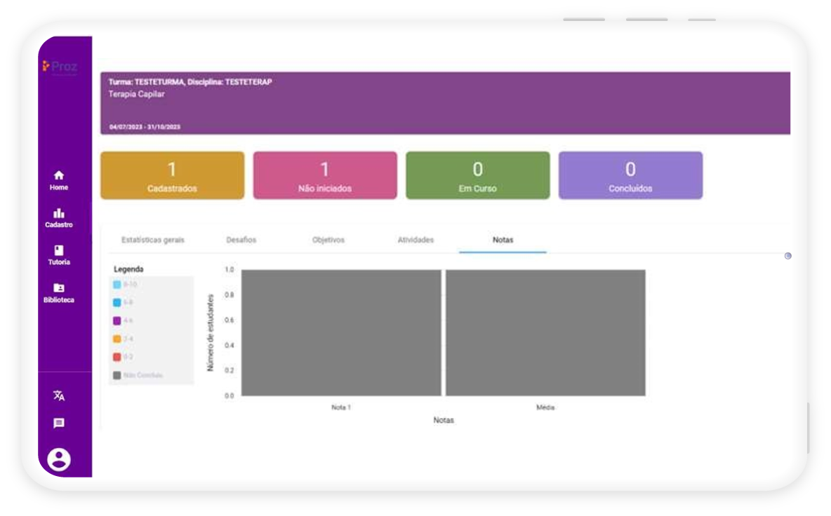 10. Nessa tela você terá acesso às estatísticas gerais, desafios, objetivos, atividades e notas dos alunos(as).