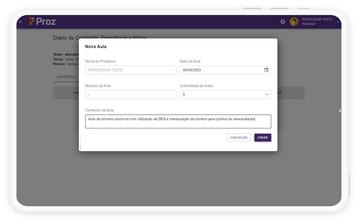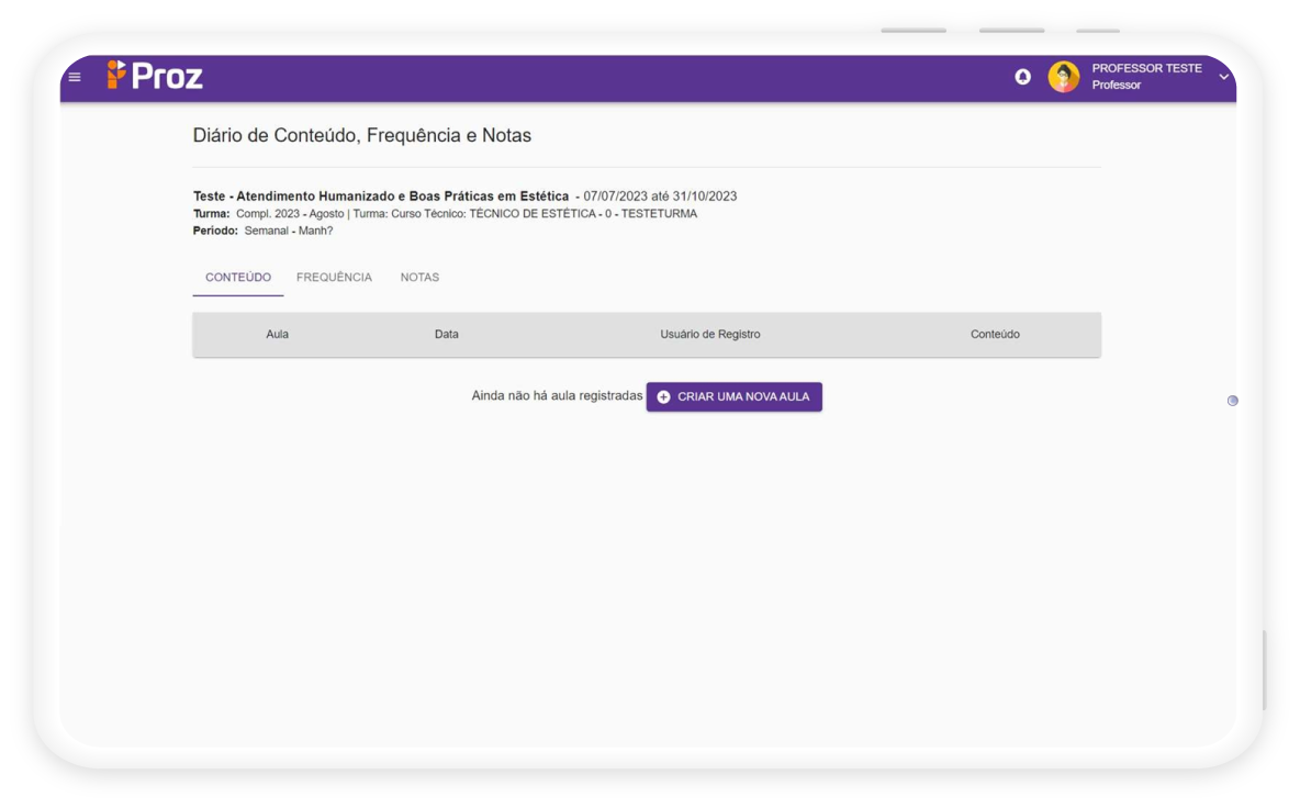 16. Clique em criar uma nova aula para iniciar os apontamentos dos alunos ausentes.