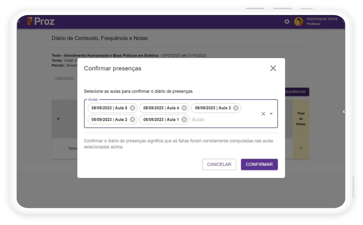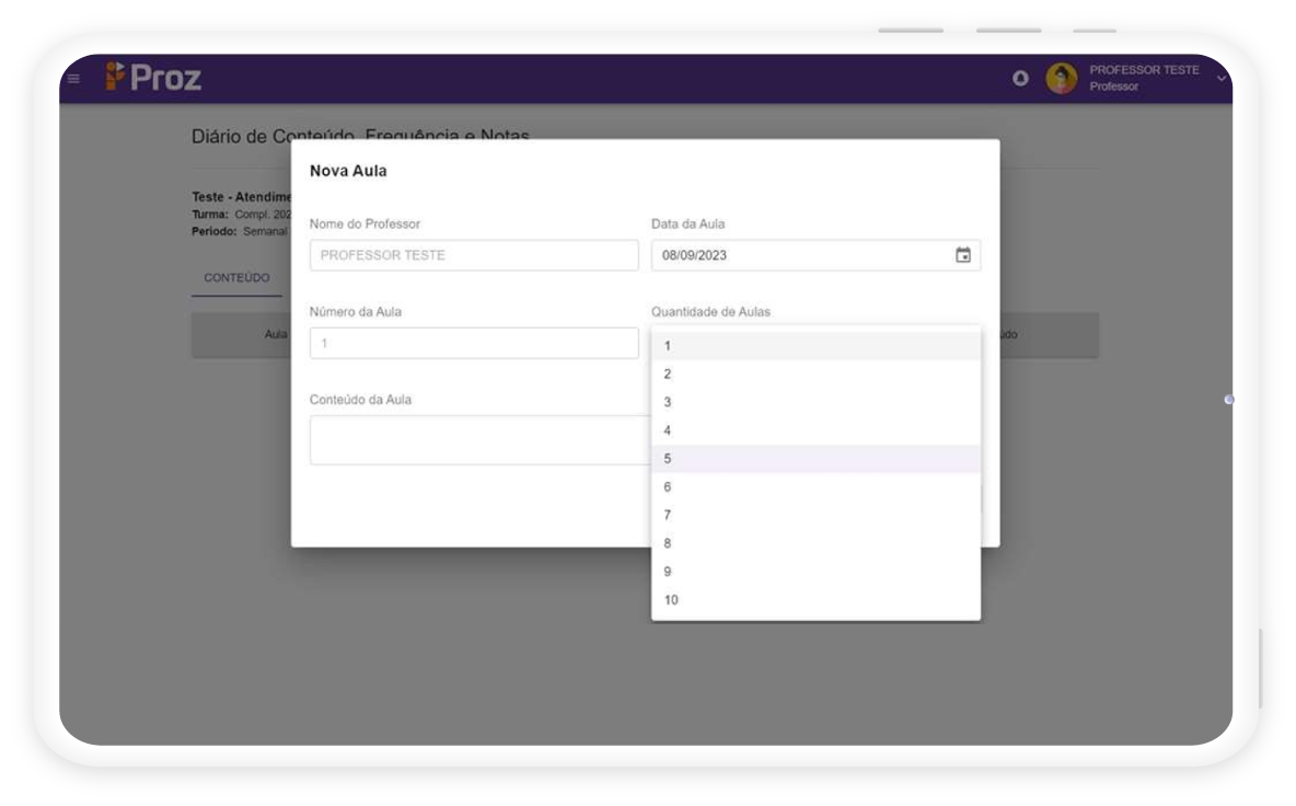 O sistema apresentará, por padrão 5 aulas, mas é possível editar essa quantidade de aulas de acordo com a necessidade de cada turma.