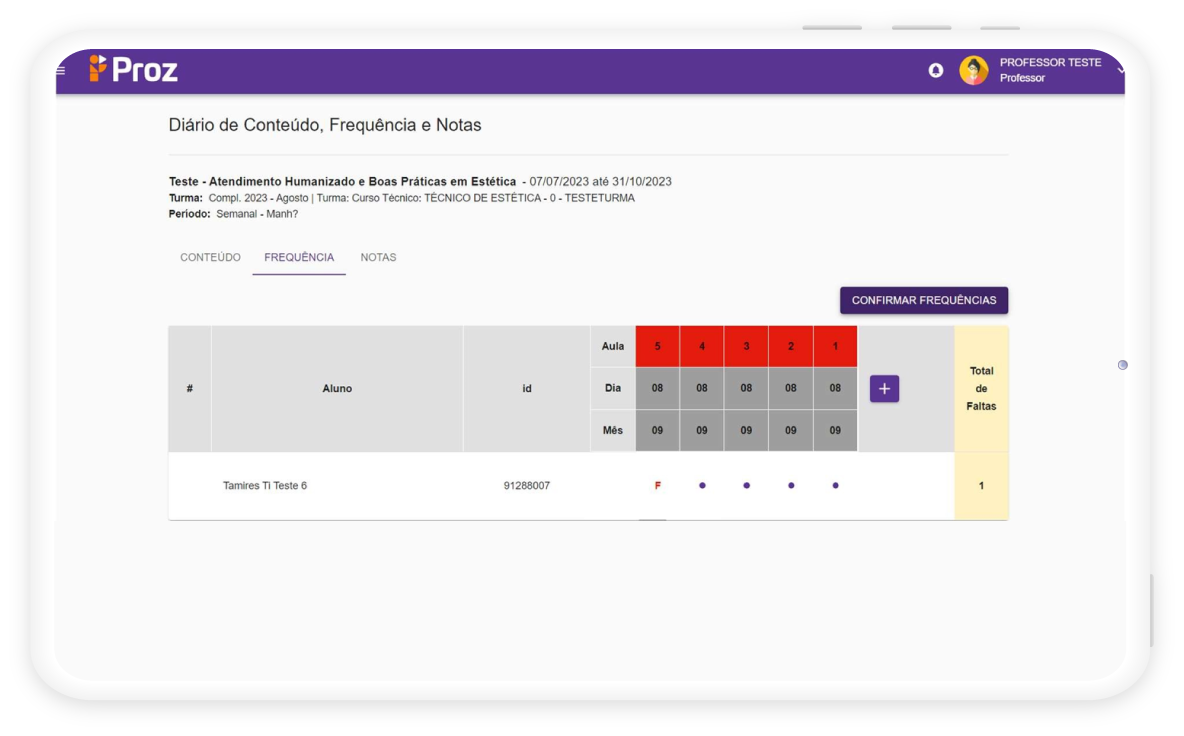 Registre a(s) faltas dos alunos(as) ausentes clicando na bolinha correspondente à aula.