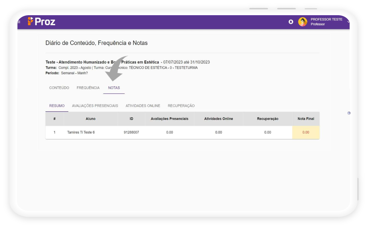 21. Clique no menu NOTAS para registrar às notas dos(as) alunos(as).