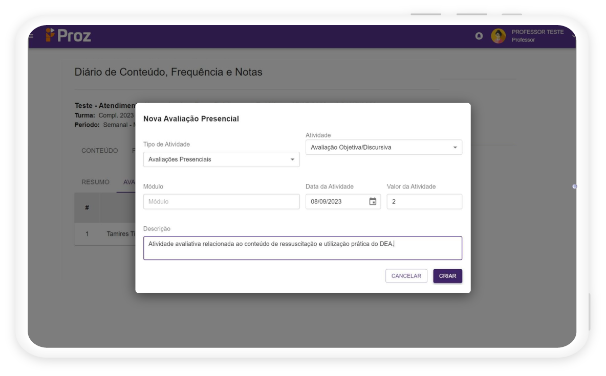 23. Cadastre o tipo de atividade, selecione a data e insira o valor da avaliação.