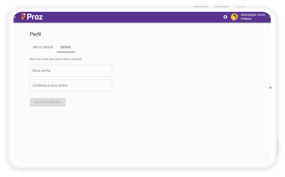 26. Ao clicar no menu senha aparecerá uma tela para o docente alterar a senha de acesso ao portal web da Proz.
