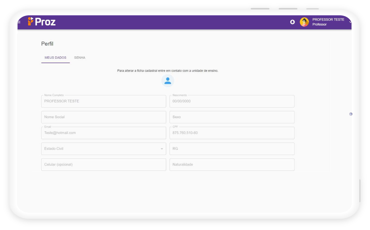 25. Ao clicar no menu o docente terá acesso ao seu perfil. Para solicitar qualquer alteração deve procurar a coordenação ou secretaria da unidade.